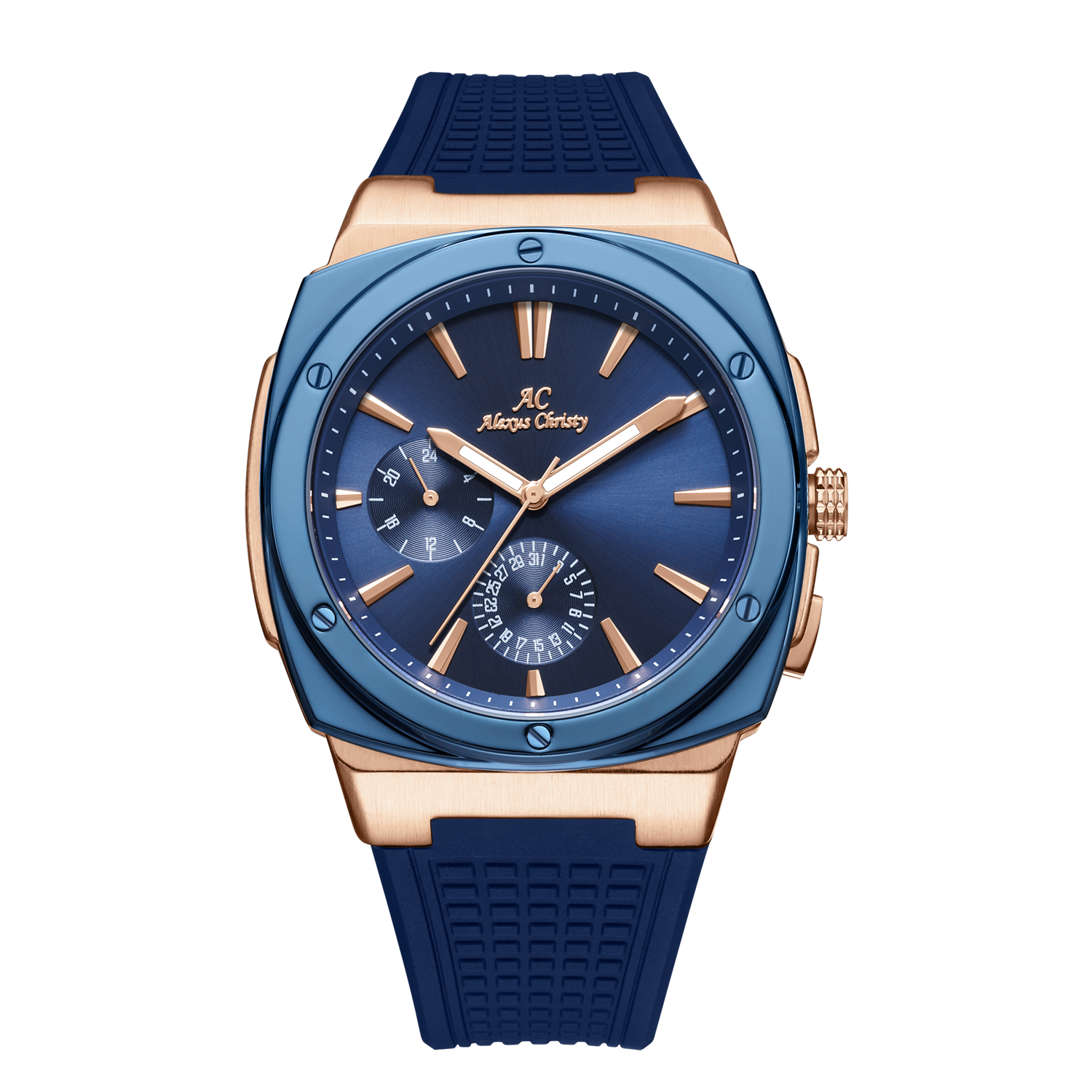 Designed for men who move with purpose, the Blue and Rose Gold Alexus Christy Momentum Drive offers bold color with classic structure. The deep navy dial and strap paired with a rose gold case create a look that's effortlessly impressive.