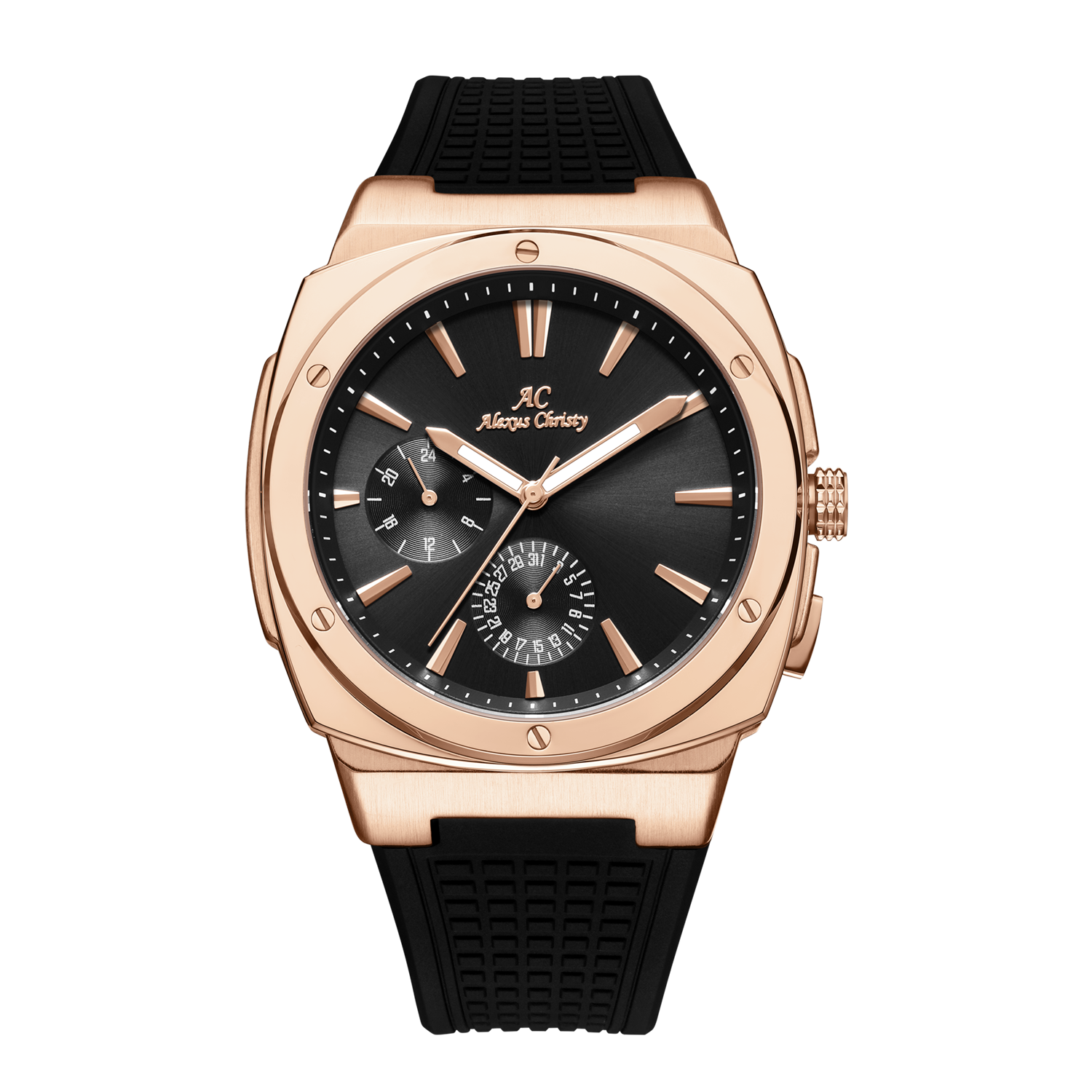 The Rose Gold Alexus Christy Momentum Drive is refined, rugged, and ready for anything. Its warm-toned case contrasts against a bold black dial and textured strap, making it your go-to for elevated everyday wear.