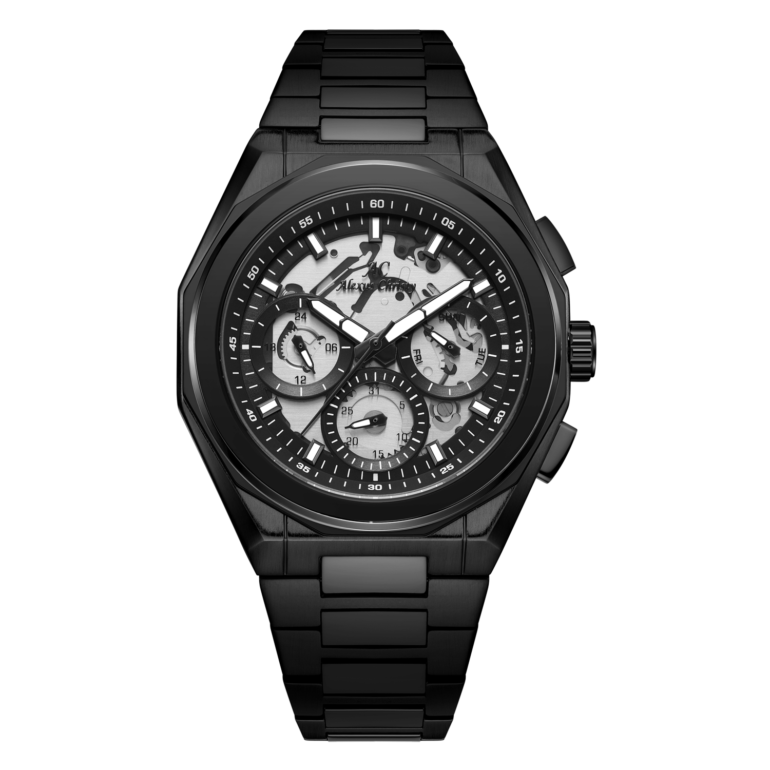 Command the room with the stealth appeal of the Alexus Christy Chronomaster Royale in All Black. Designed for the modern minimalist, this timepiece showcases a skeletal dial behind a matte black stainless steel finish. The perfect balance of function and form, it delivers powerful performance in a sleek silhouette.