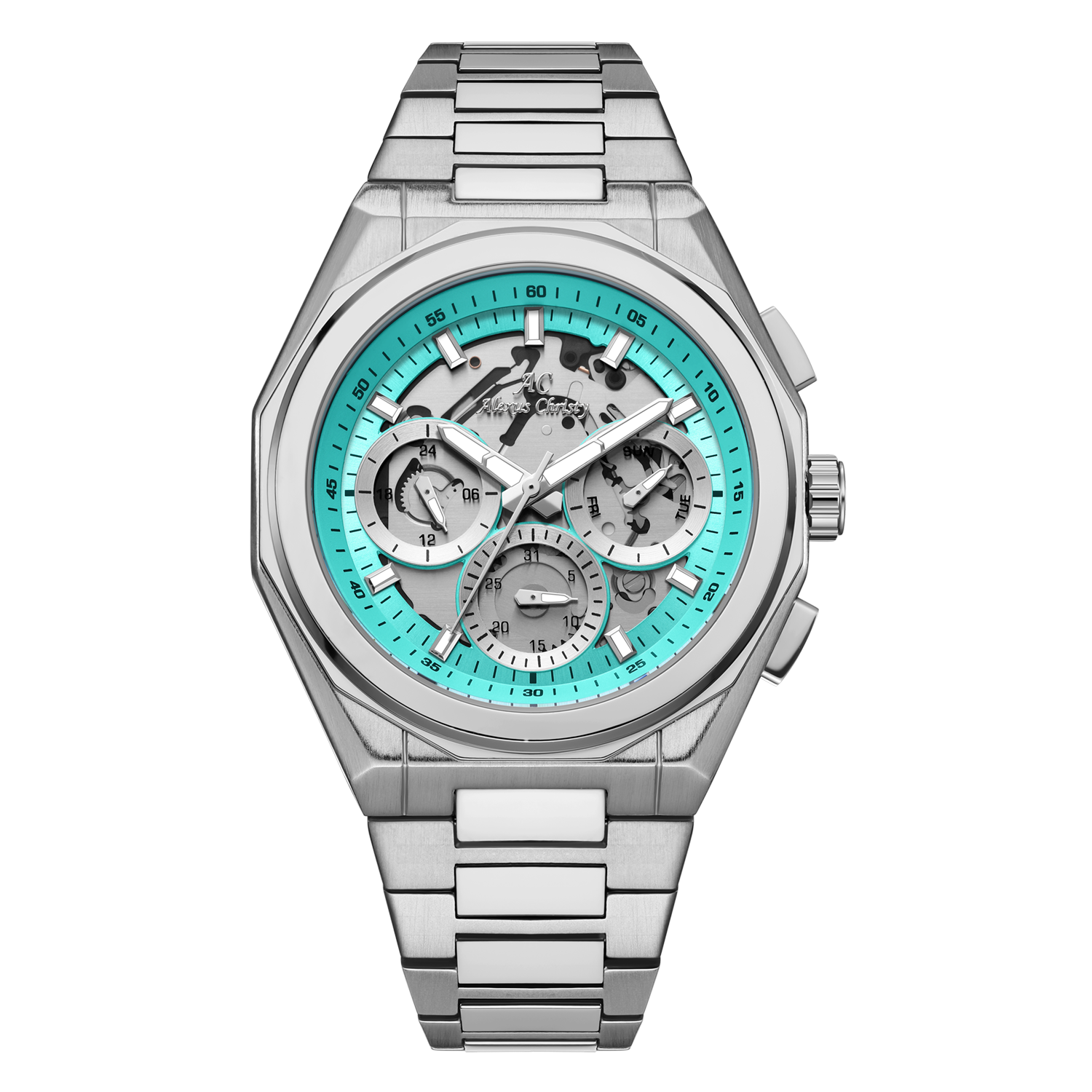Stand out with icy precision and bold design in the Alexus Christy Chronomaster Royale – Silver with turquoise Accents for the style-forward man. The cool-toned turquoise chapter ring frames a partially open skeleton dial, giving a glimpse into the watch’s intricate quartz movement while delivering a uniquely vibrant twist on a classic chronograph layout.
