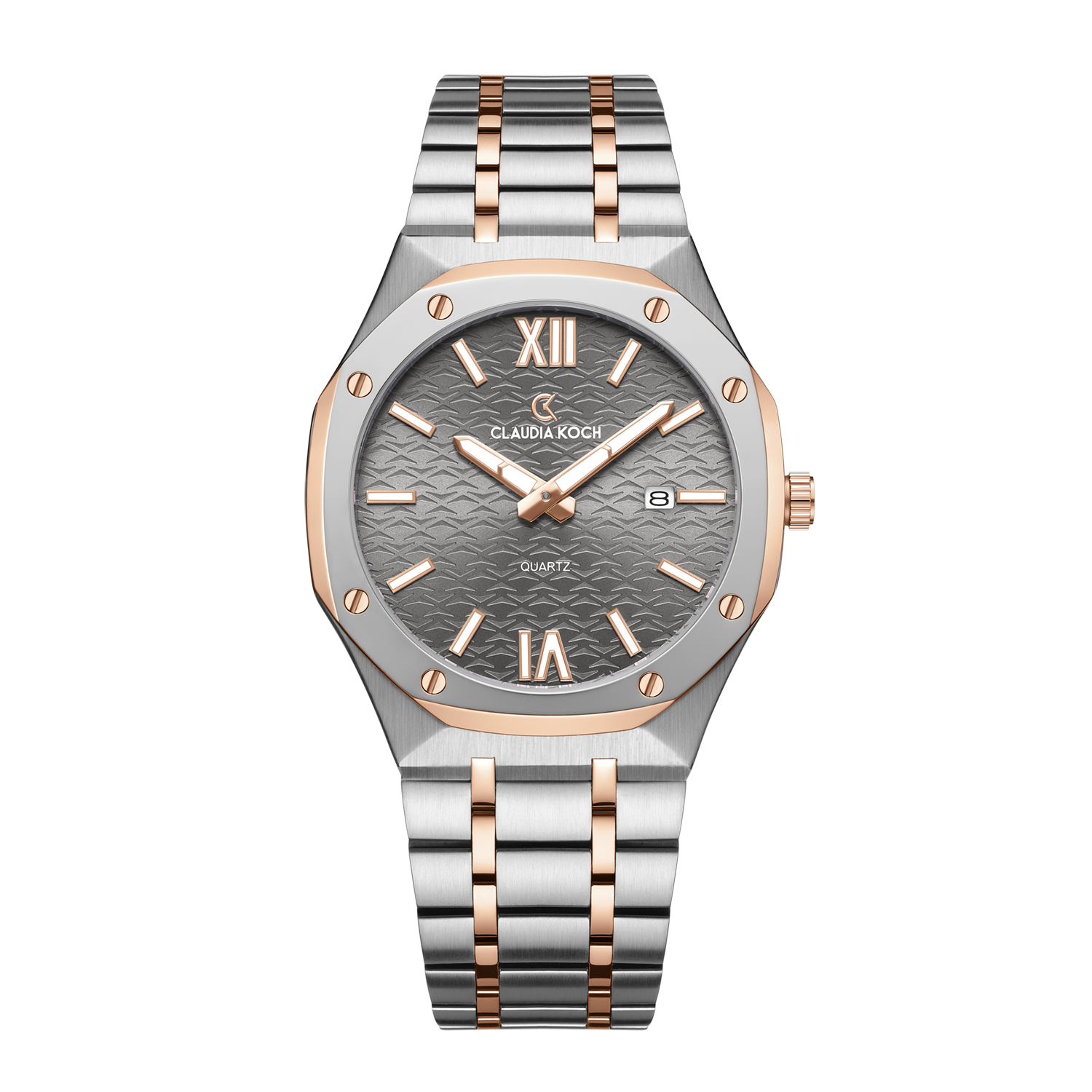 For those who appreciate understated luxury, the Claudia Koch Two-Tone Rose Gold Watch with Gunmetal Dial is the perfect expression of modern elegance. The cool-toned grey dial features a subtle pattern that adds depth without distraction, while rose gold hour markers and Roman numerals bring warmth and sophistication. The two-tone bracelet combines brushed steel with polished rose gold center links, creating a look that’s both balanced and beautiful. This watch is made for individuals who value refined details and versatile design.
