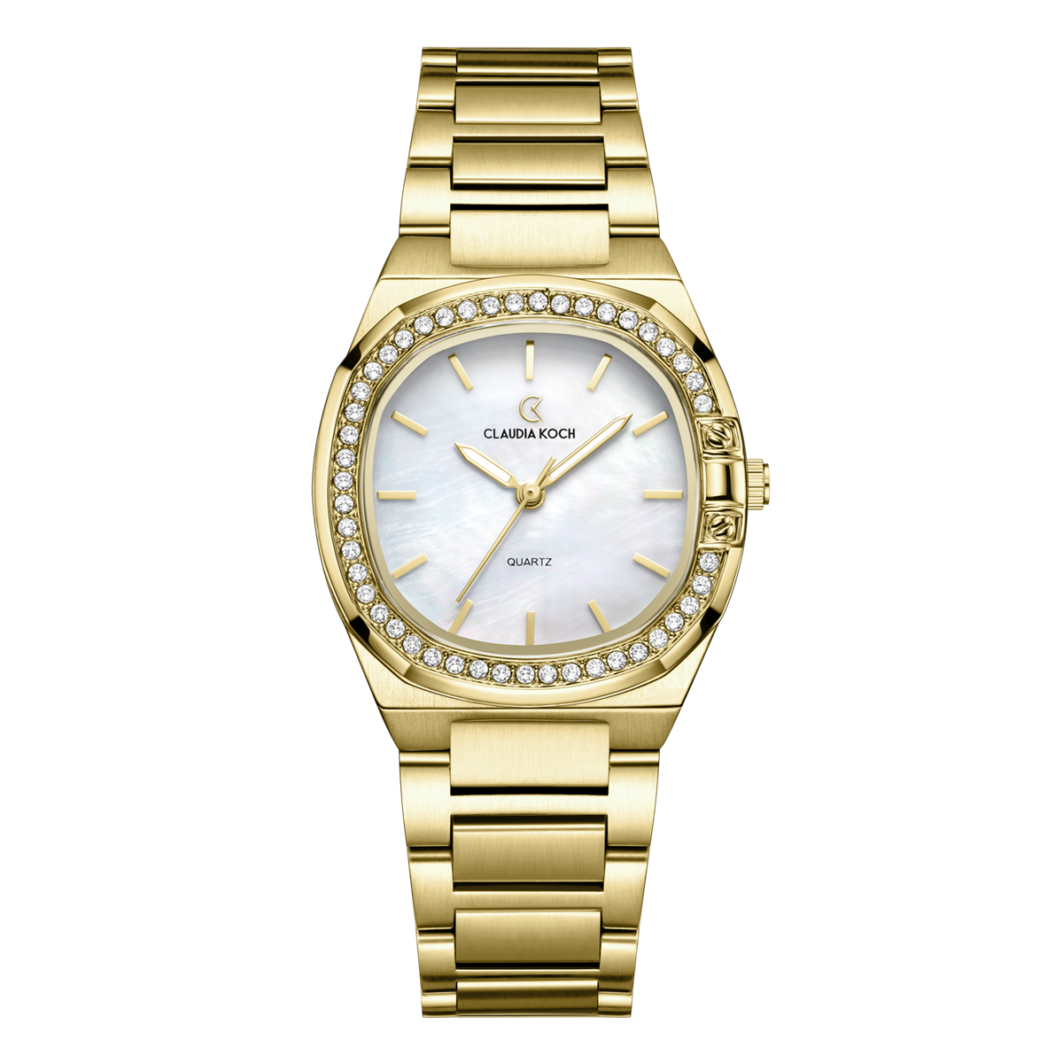 Indulge in luxury with this stunning women’s watch, featuring a slightly curved square dial adorned with shimmering stone accents. The elegant curve of the dial not only enhances comfort but also adds a unique touch of sophistication. The sparkling stones catch the light beautifully, making this timepiece a true statement piece. Perfect for elevating your formal attire or adding a touch of glamour to your everyday look, this watch combines timeless elegance with modern style.