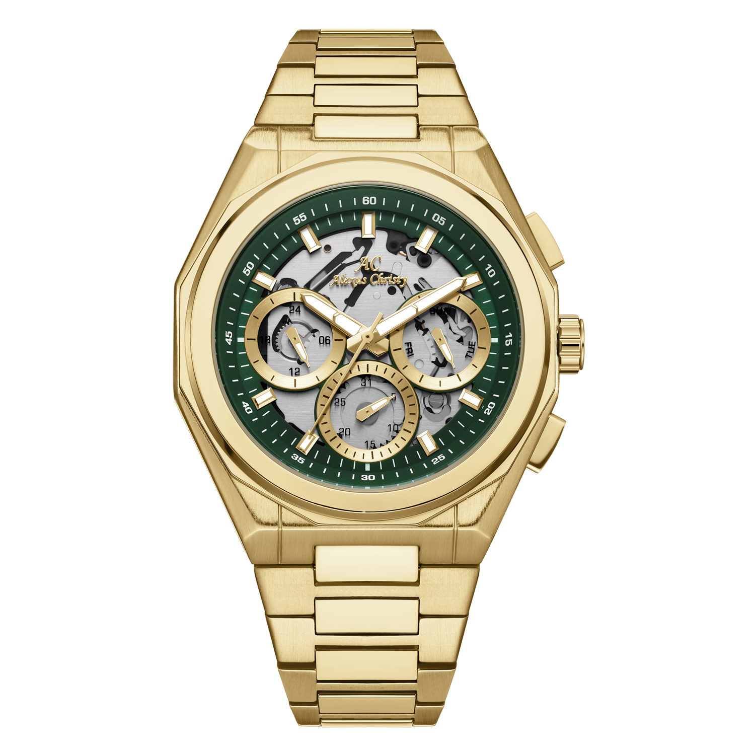 Luxurious and unforgettable, the Alexus Christy Chronomaster Royale in Gold and Green blends heritage aesthetics with contemporary finesse. A gold-tone stainless steel case pairs with a rich emerald bezel and skeleton dial, offering a glimpse into the watch’s intricate chronograph movement. Make a statement without saying a word.
