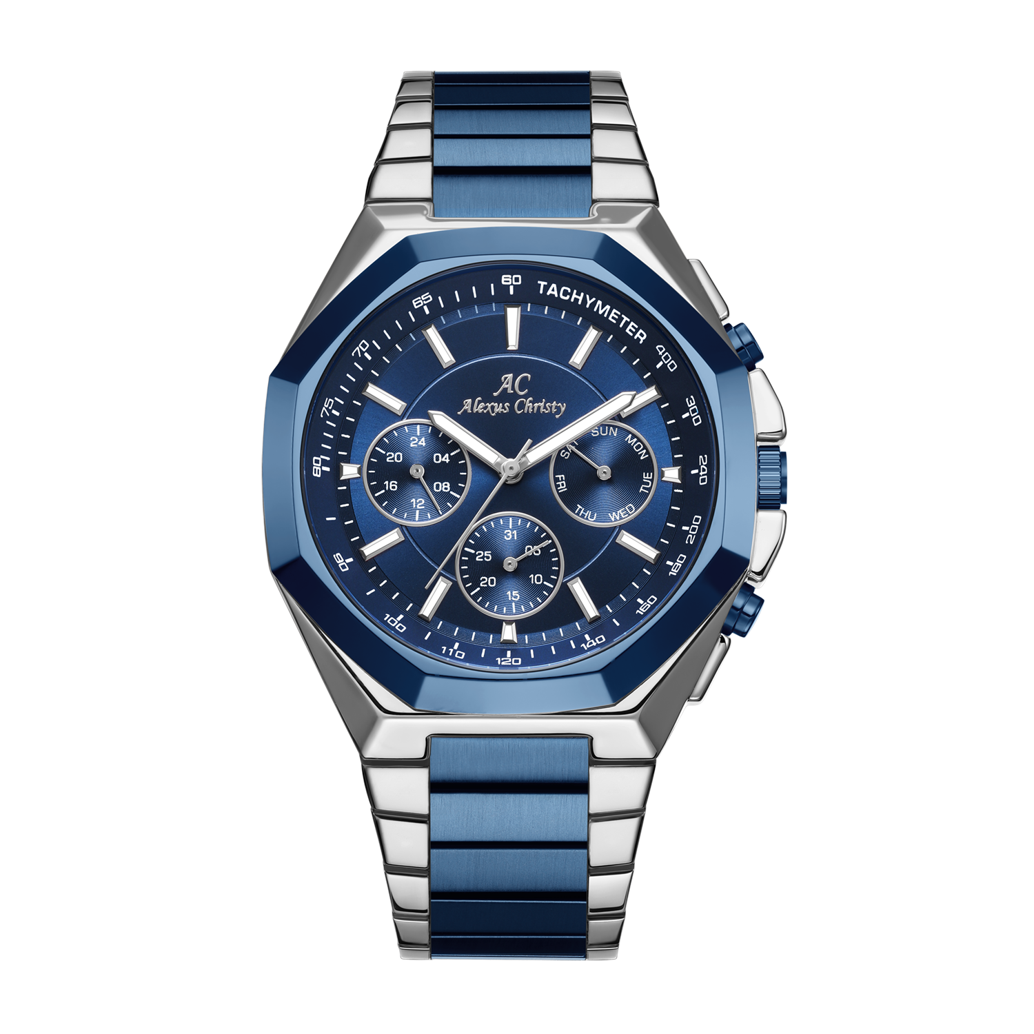 Blue dial with chronograph subdials for day, date, and 24-hour time