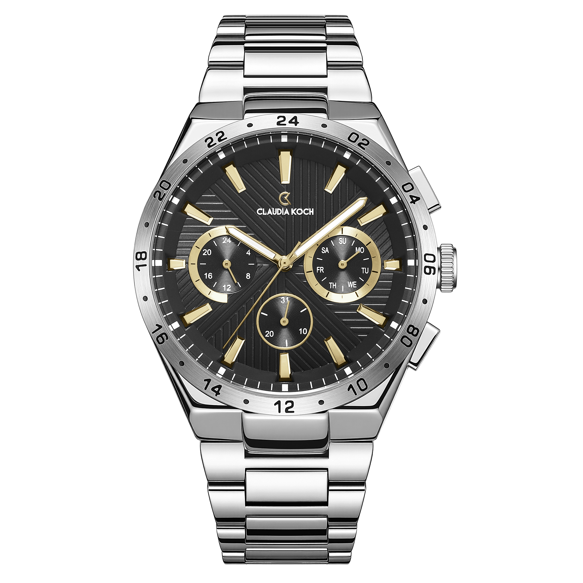 The CK Axis in silver with black and gold accents creates a refined contrast that feels both bold and elegant. Gold-toned details highlight the subdials and markers, adding warmth to the structured, technical design.